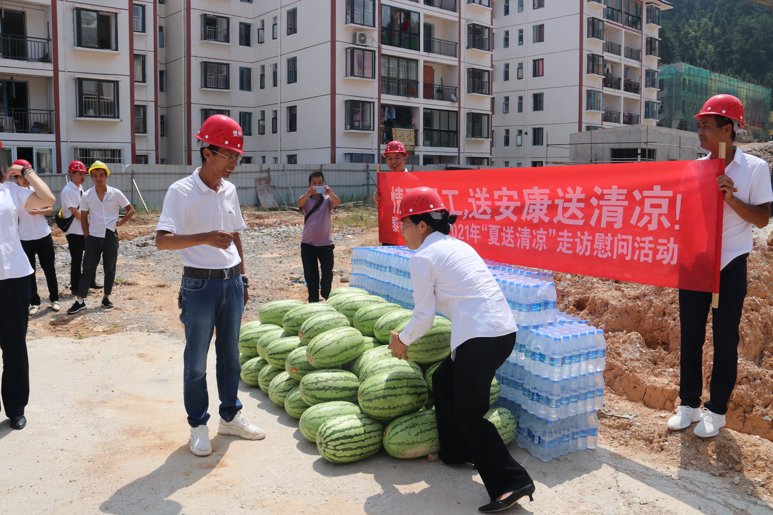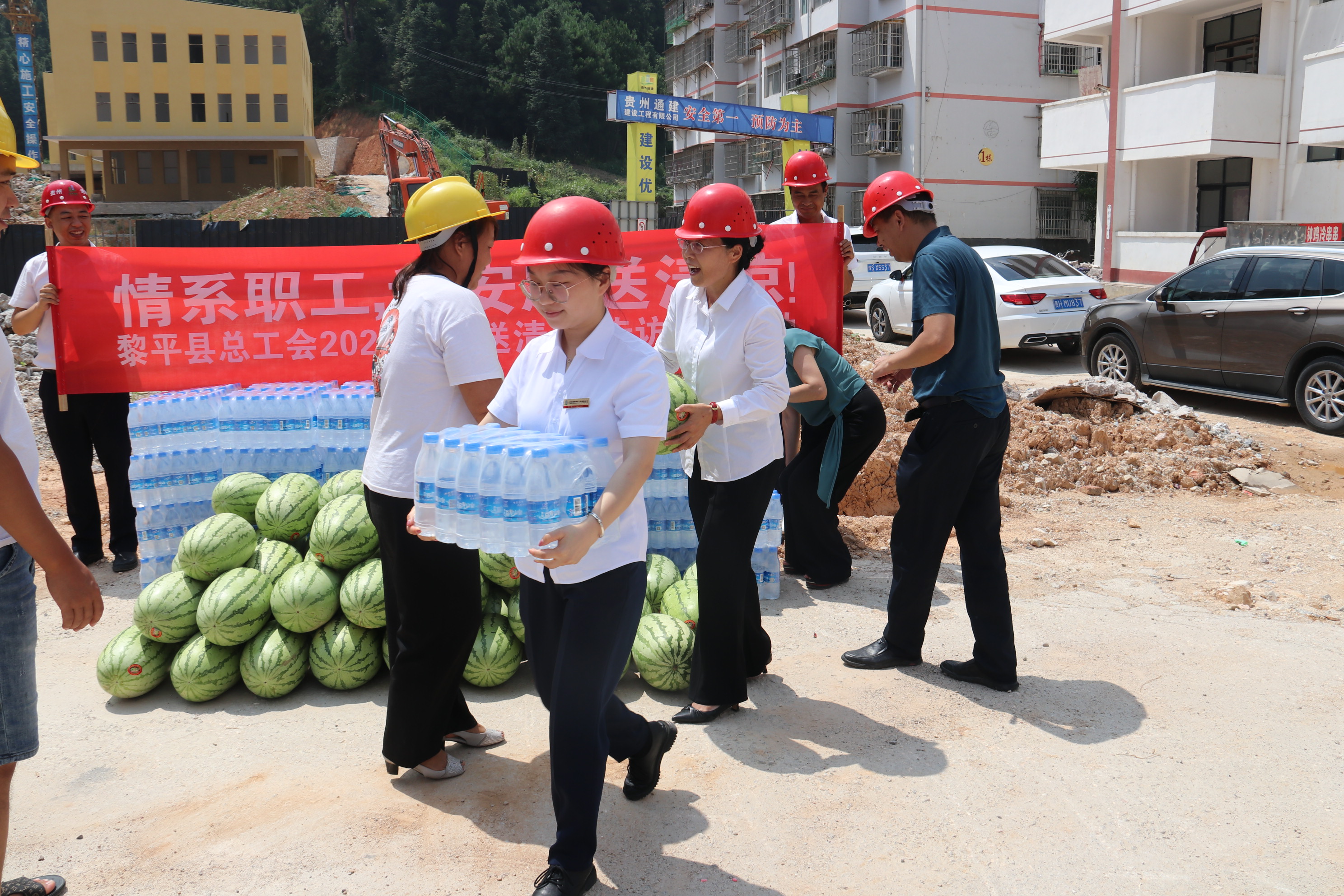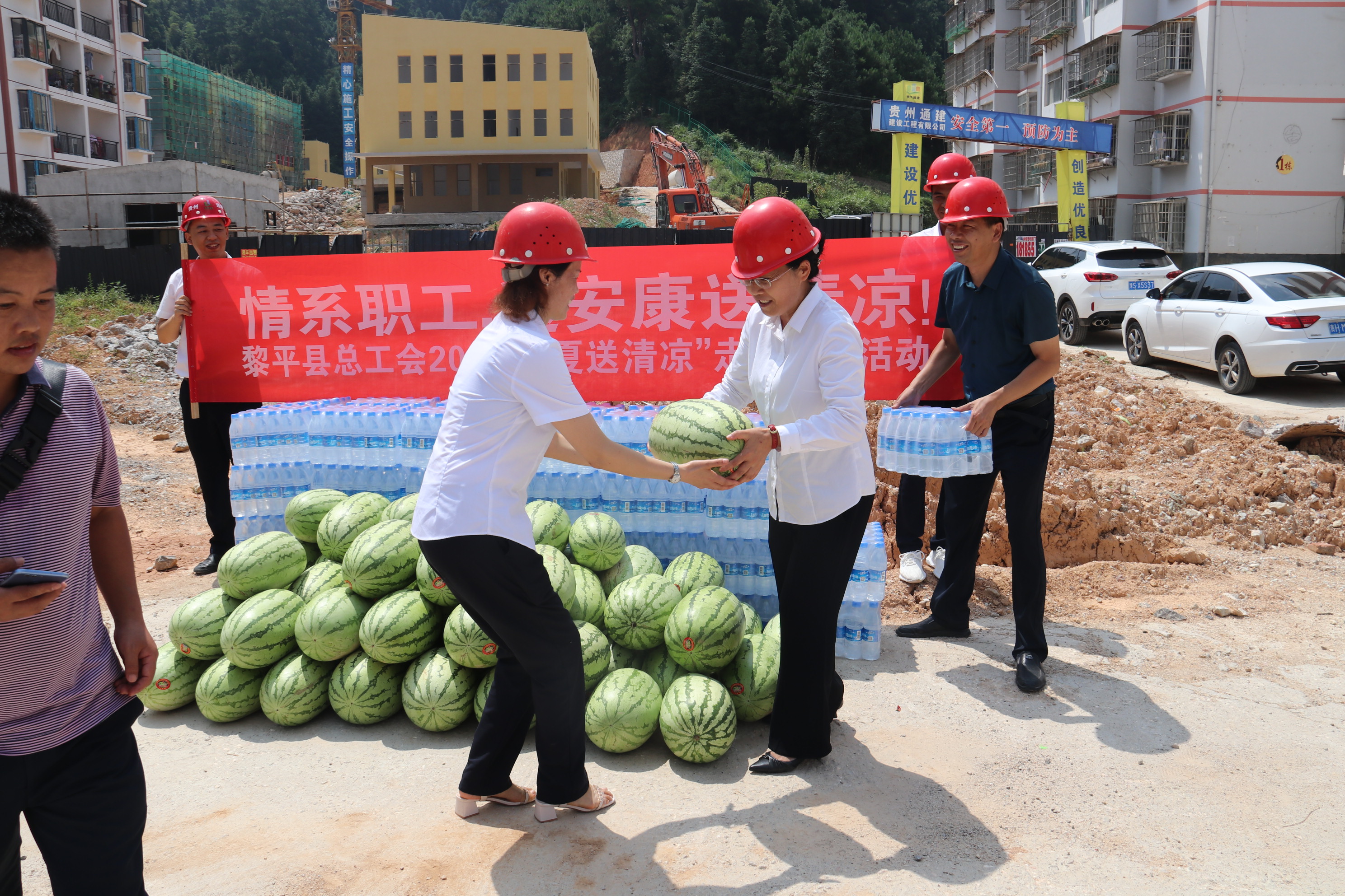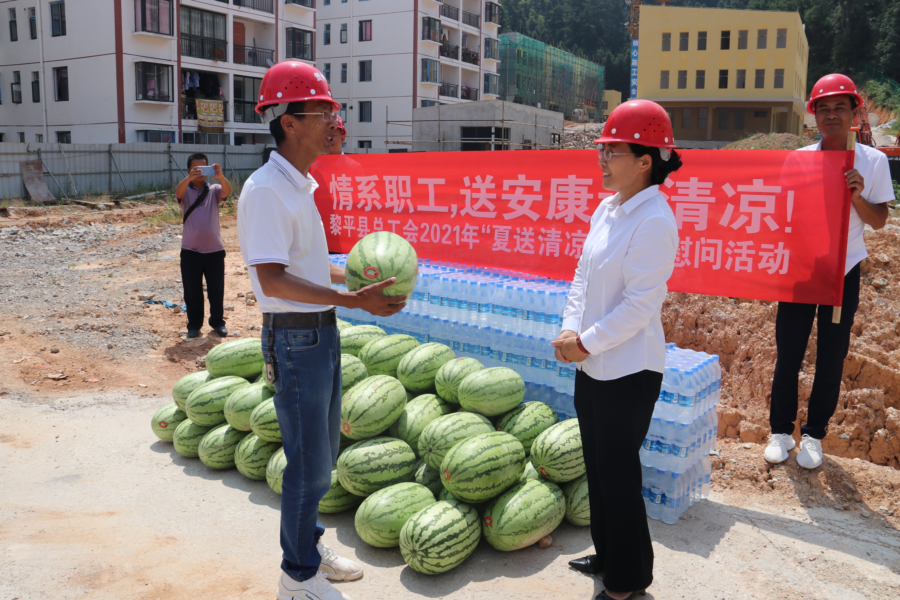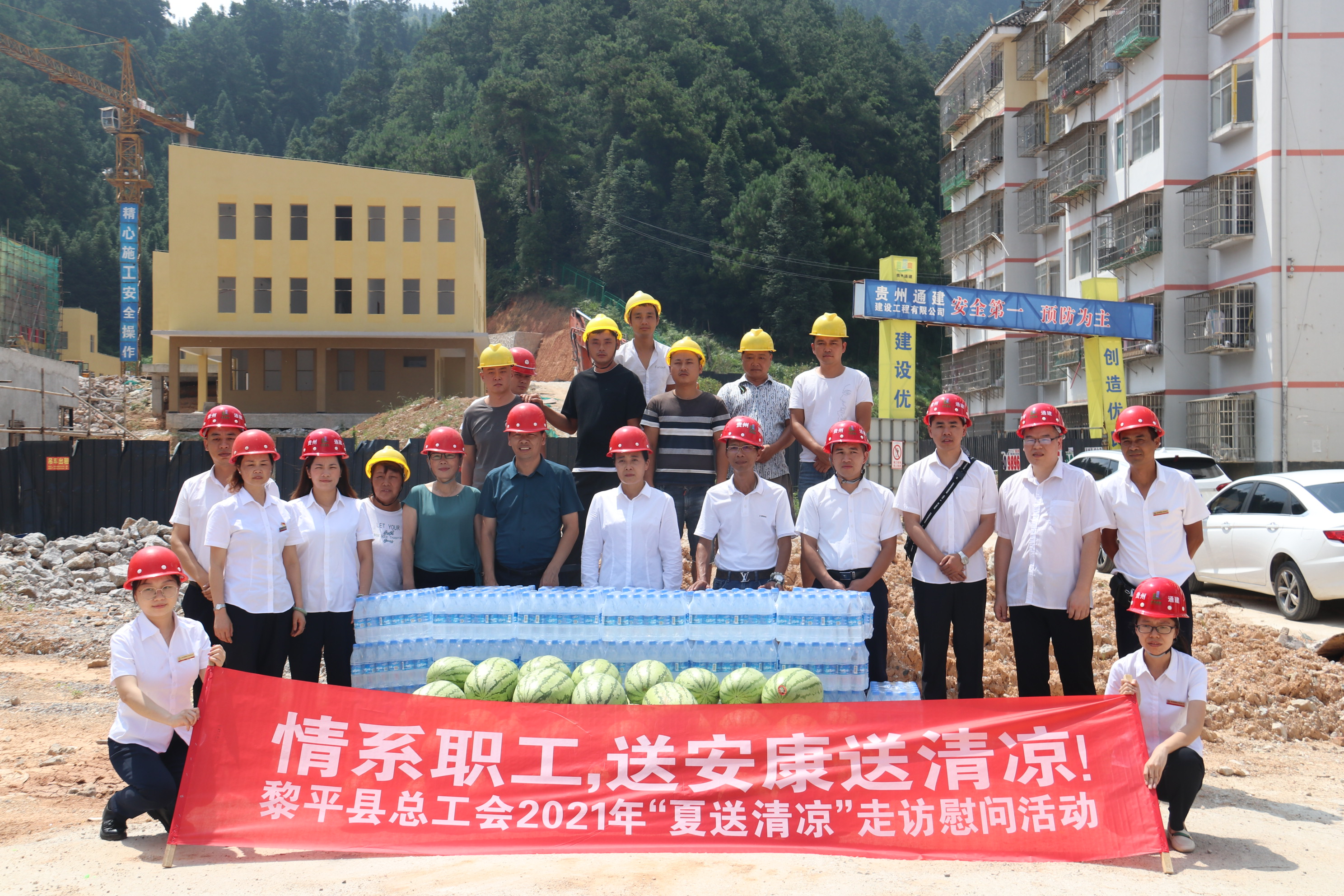 炎炎夏日,酷暑难耐。2021721日上午,黎平县县总工会党组书记常务副主席龙懿、县总工会副主席王平森、县总工会副主席石晓烨等一行6深入贵州通建建设工程有限公司“黎平县何家庄安置区2号幼儿园建设项目”项目部,亲切慰问冒着酷暑战斗在一线的公司职工、建筑工人,为在高温情况下仍坚持工作的一线工人送去清凉和关怀。本次慰问活动,县总工会共为该项目部工人送去西瓜500公斤、矿泉水50